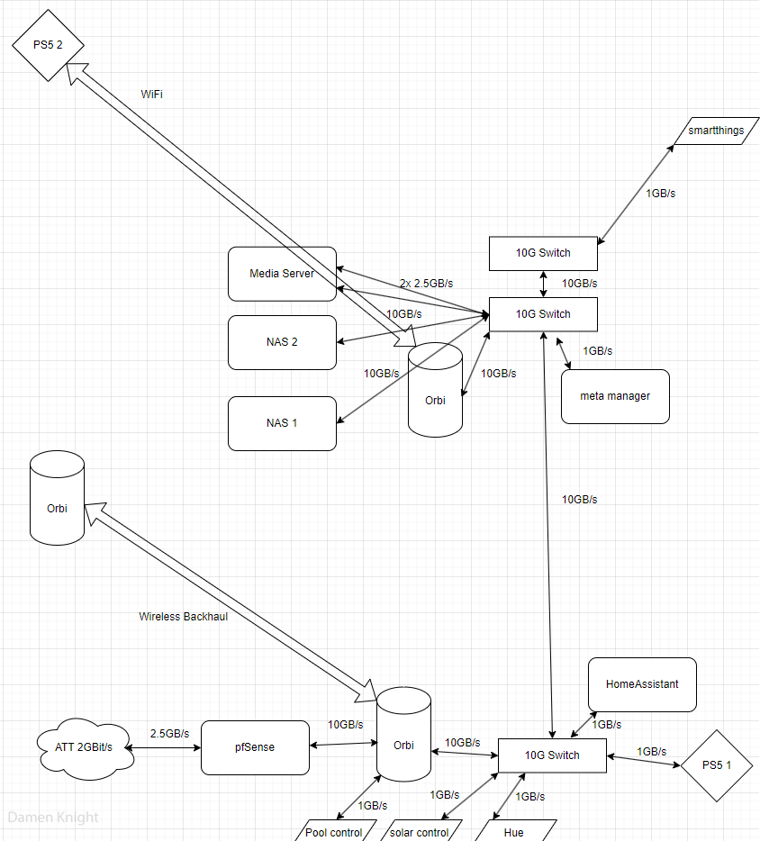 Network Setup January 22, 2024 Damen Knight WiFi: NetGear Orbi RBRE960 (AP mode, 3AP Mesh)Router: Custom MiniPC pfSense Router (10GBit LAN, 2.5GBit WAN)